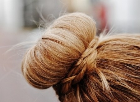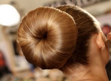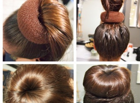 - Se prinde parul cu un elastic intr-o coada de cal pe spate sau lateral, apoi se aplica donutul in aceeasi pozitie ca si elasticul. Varfurile parului se intorc si se prind sub donut cu agrafe.
