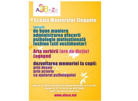 Scoala Manierelor Elegante "ABeZe" va contribui la corectarea, modelarea sau completarea unor aptitudini, comportament si dictie. Dispunem de instructori valorosi, ne caracterizam prin competenta profesionala , receptivitate si calitate.